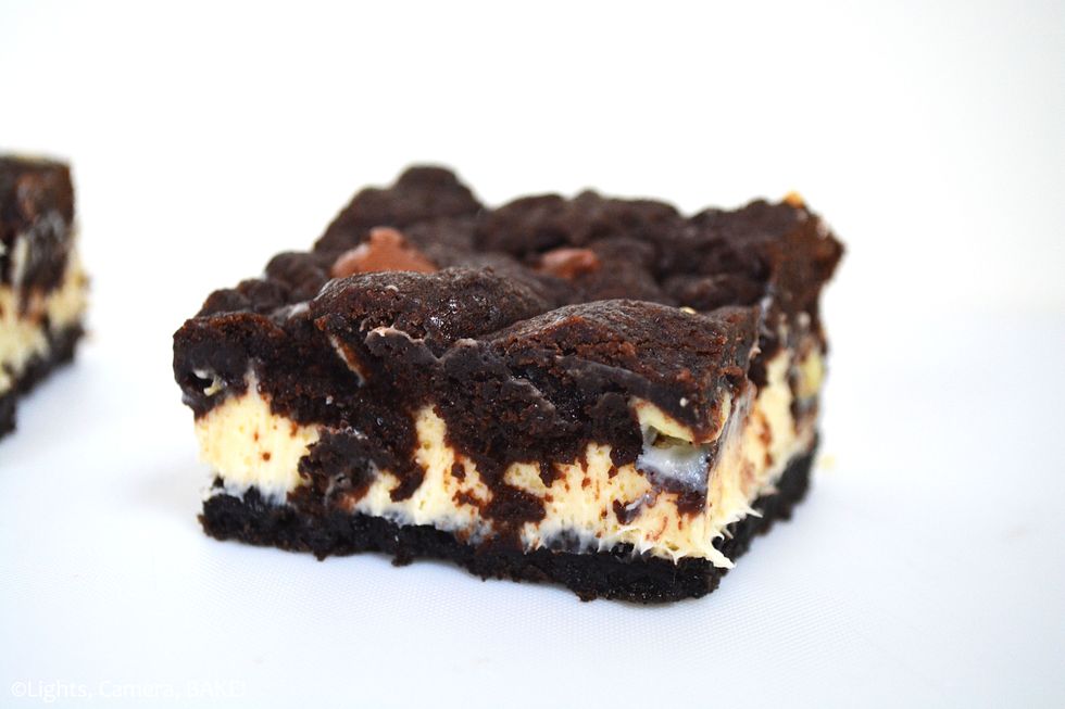 These bars are an Oreo base with a creamy cheesecake middle finished with a chewy and soft chocolate cookie top.