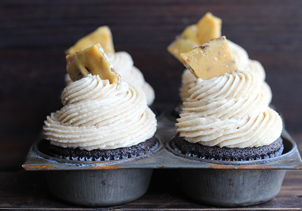 A rich, dark chocolate cupcake piled high with a maple pecan swiss meringue buttercream. It's garnished with a pecan brittle. This is the perfect fall cupcake.