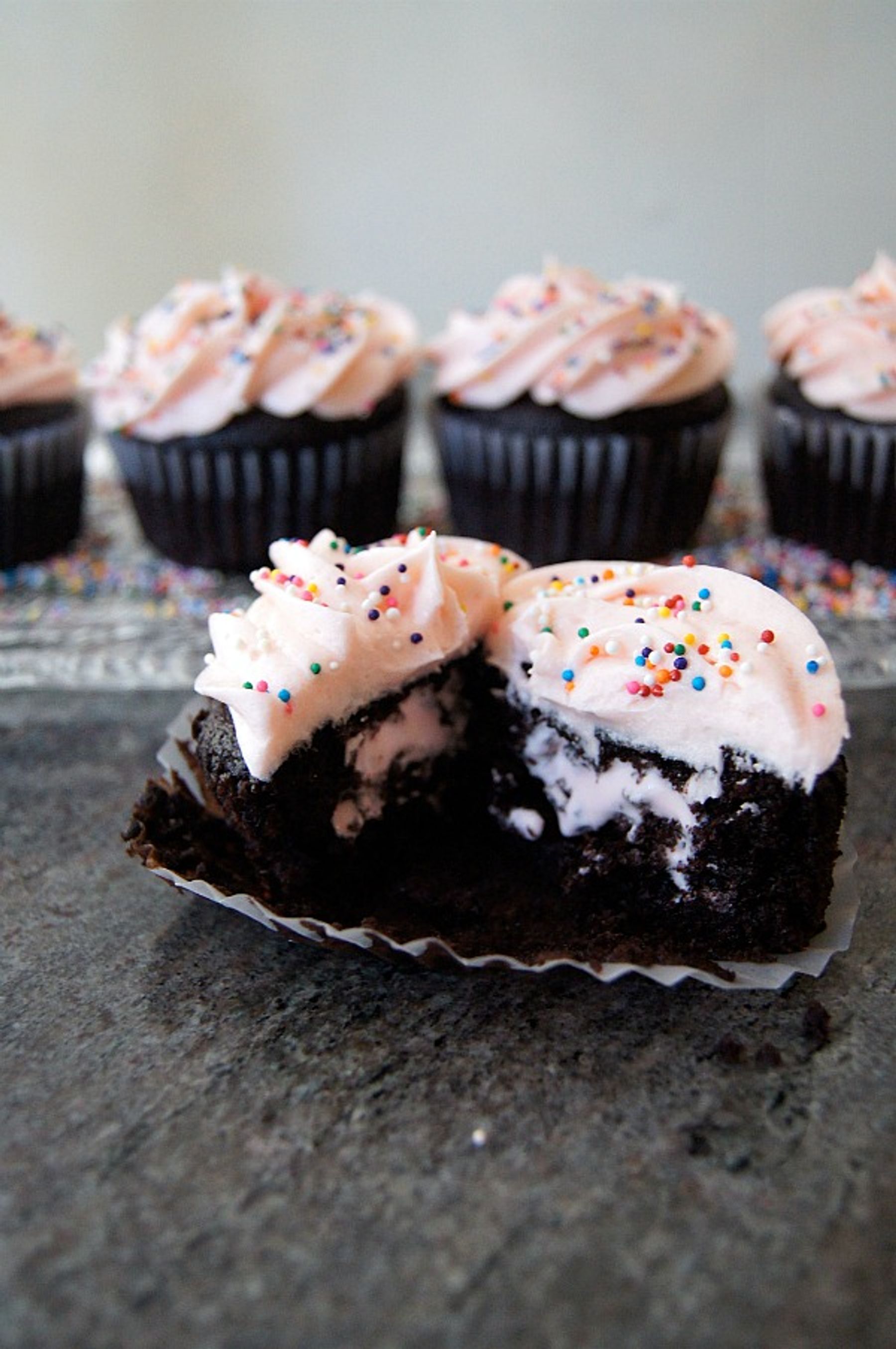 Homemade chocolate cupcakes with delicious marshmallow filling.