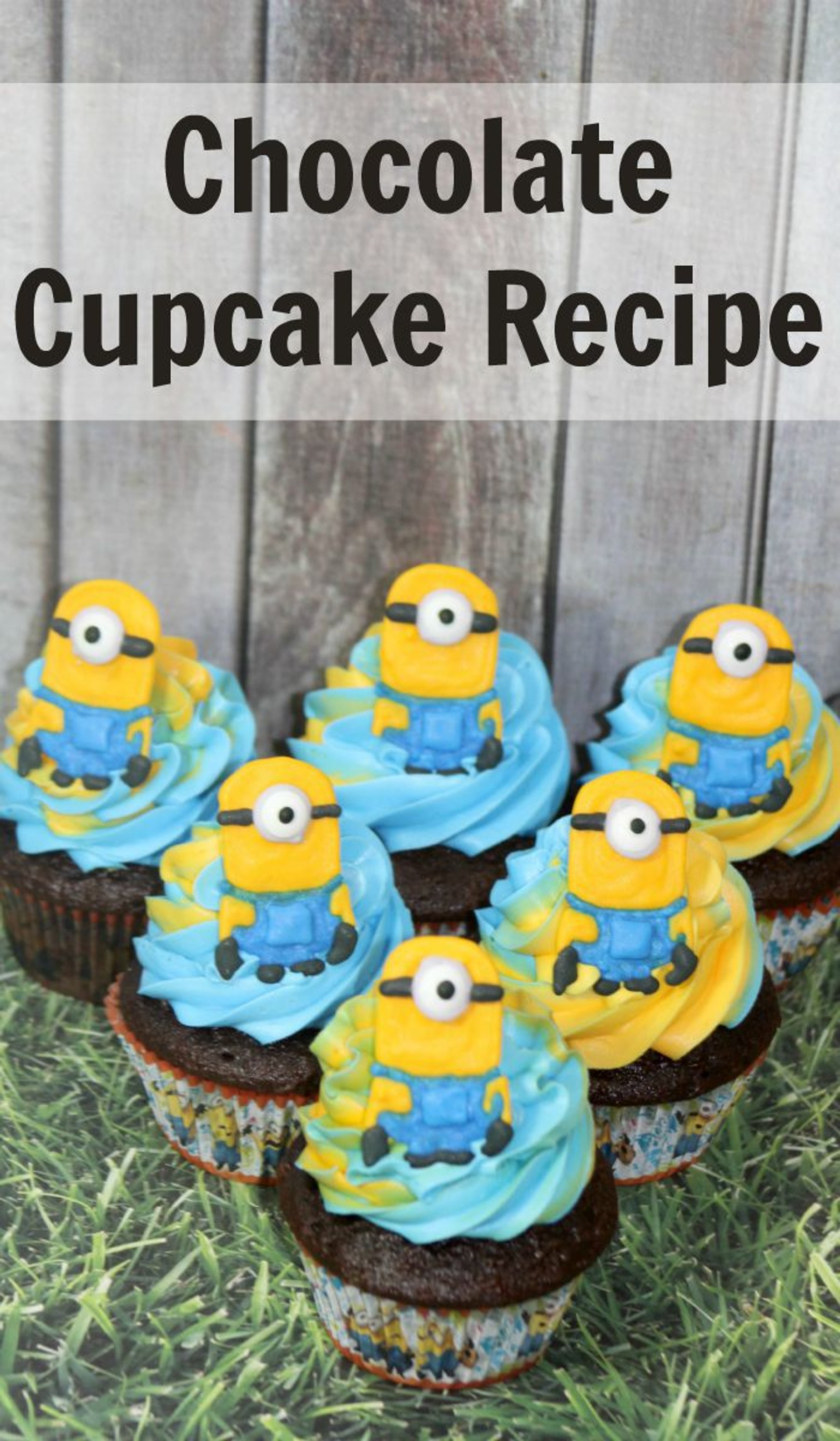 These cute Minion cupcakes are perfect for *your* little minion! This chocolate cupcake recipe is fairly basic. You can experiment with fillings if you want, too! My favorite part, aside from the little minon toppers, is the two toned icing, just like how they make it at the bakery - don\\\'t be intimidated - it\\\'s actually pretty easy!