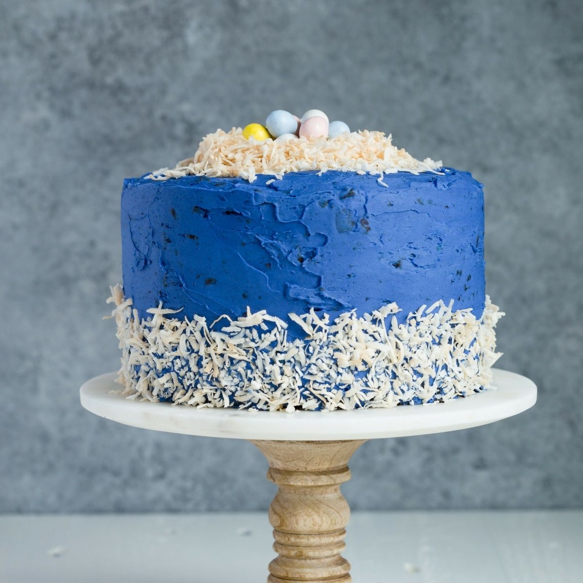 Chocolate Easter Cake with decadent chocolate layers and vanilla buttercream frosting. Tint the frosting with a fun color and garnish the cake with milk chocolate eggs and coconut.