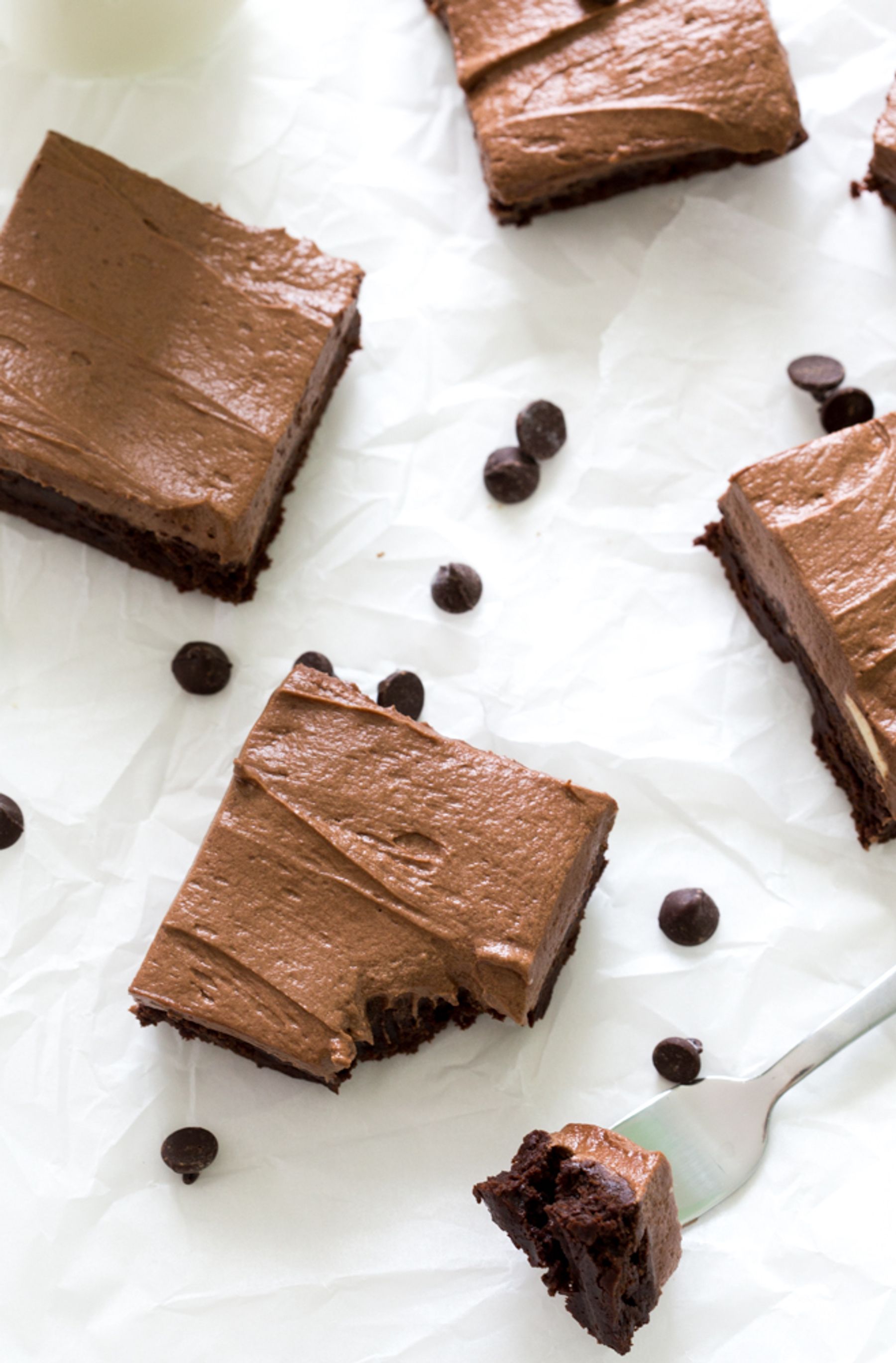 Thick and Fudgey Chocolate Frosted Brownies topped with a thick layer of Chocolate Buttercream Frosting.