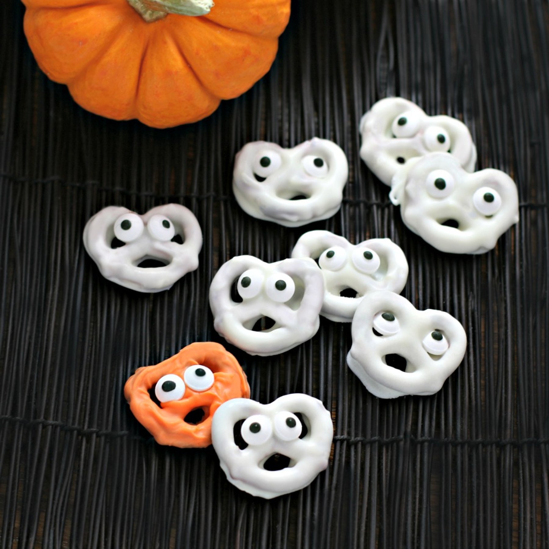 Delicious Chocolate Ghost Pretzels are salty/sweet white chocolate dipped mini pretzels turned into darling little ghosts with candy eyes using only 3 ingredients. It’s the perfect (and tastiest) edible craft for little kids too. Boo!
