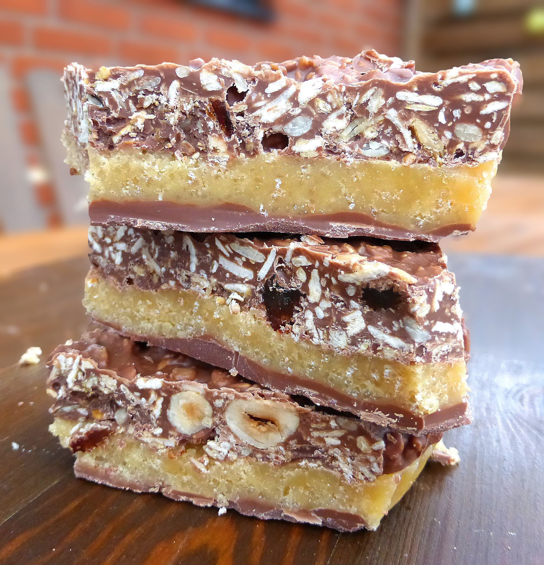 Delicious chocolate topped with homemade soft toffee and finished off with nutty granola smothered in more chocolate. What a dessert!