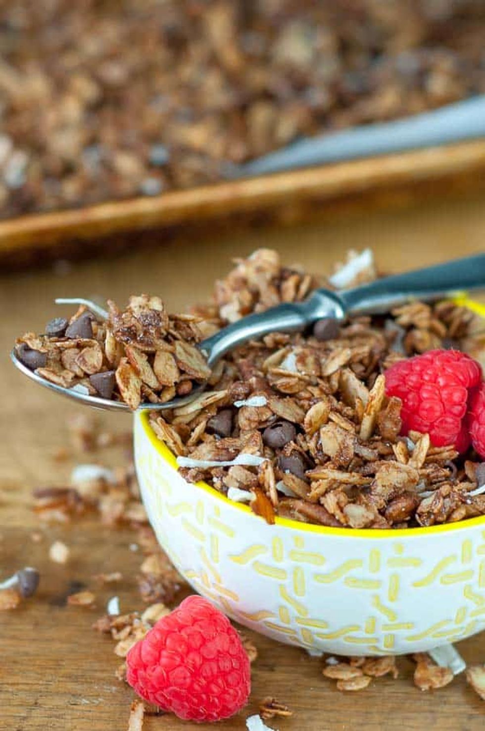 This Chocolate Granola recipe is easy to make and tastes so indulgent you won't believe it's actually good for you! How can you go wrong with spoonfuls of chocolate clusters, full of rolled oats, coconut, and chopped nuts?