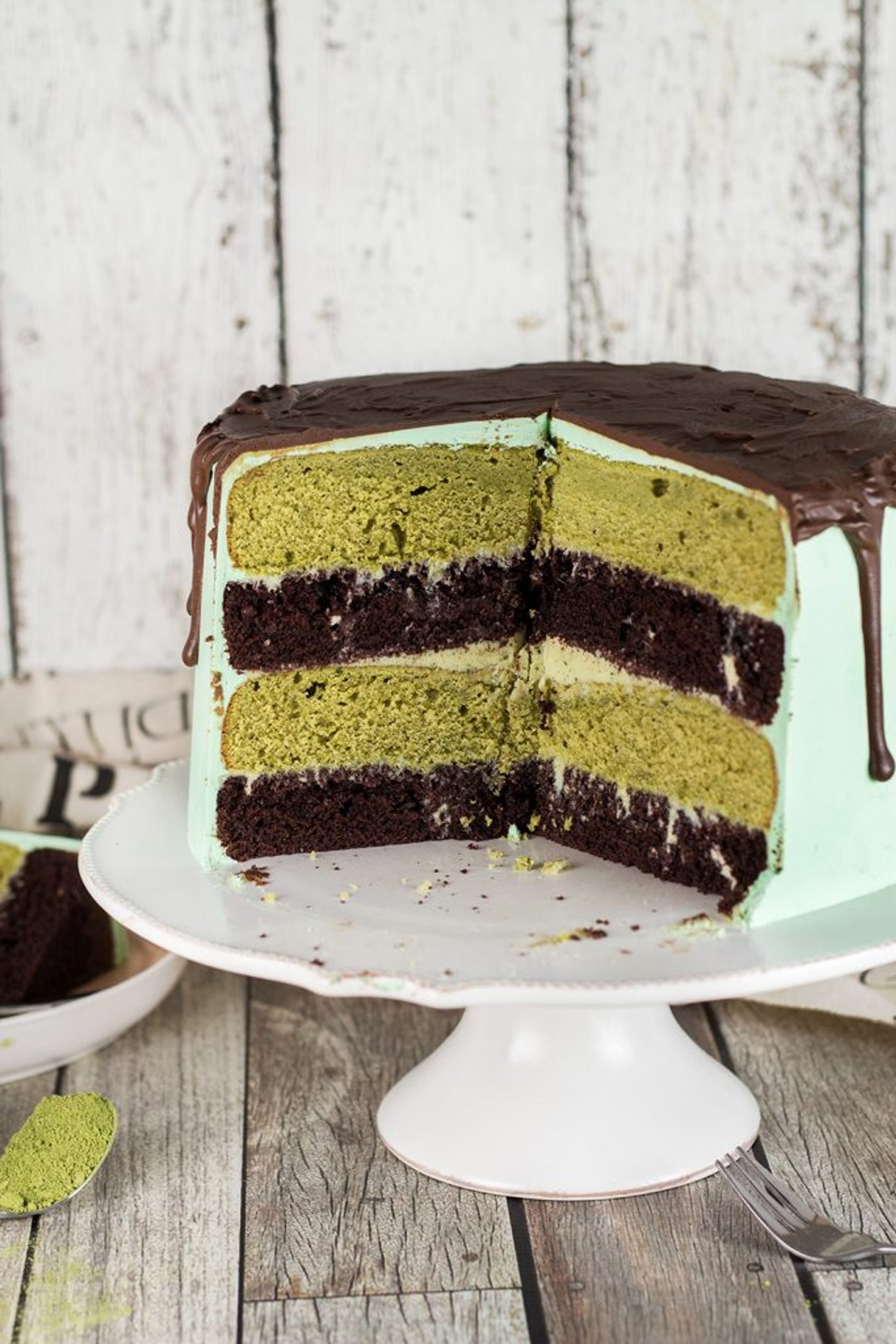 This Green Tea Cake features chocolate and matcha cake layers slathered with matcha white chocolate ganache.