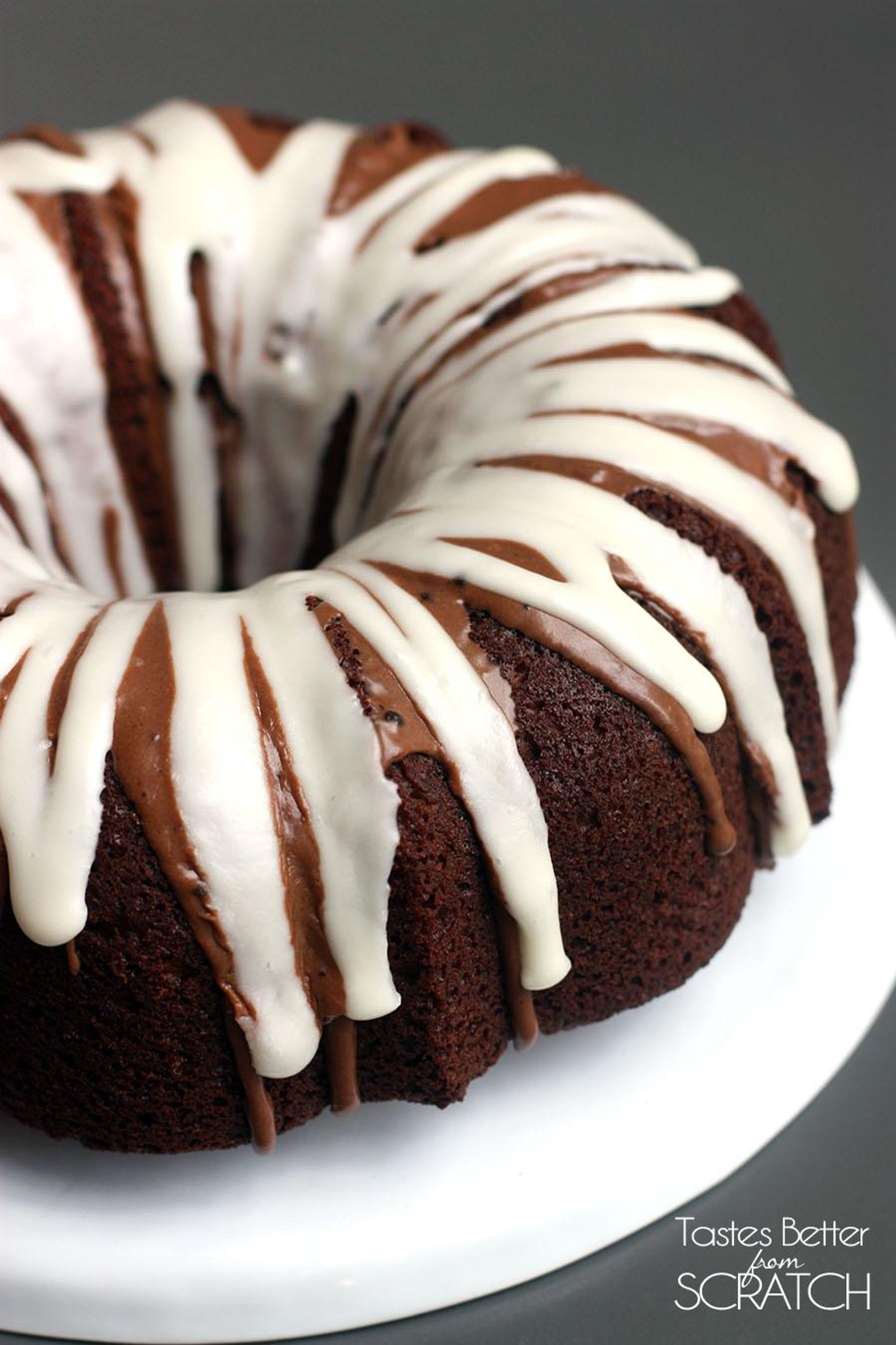 Homemade chocolate cake with coconut macaroon filling and chocolate and vanilla glaze.