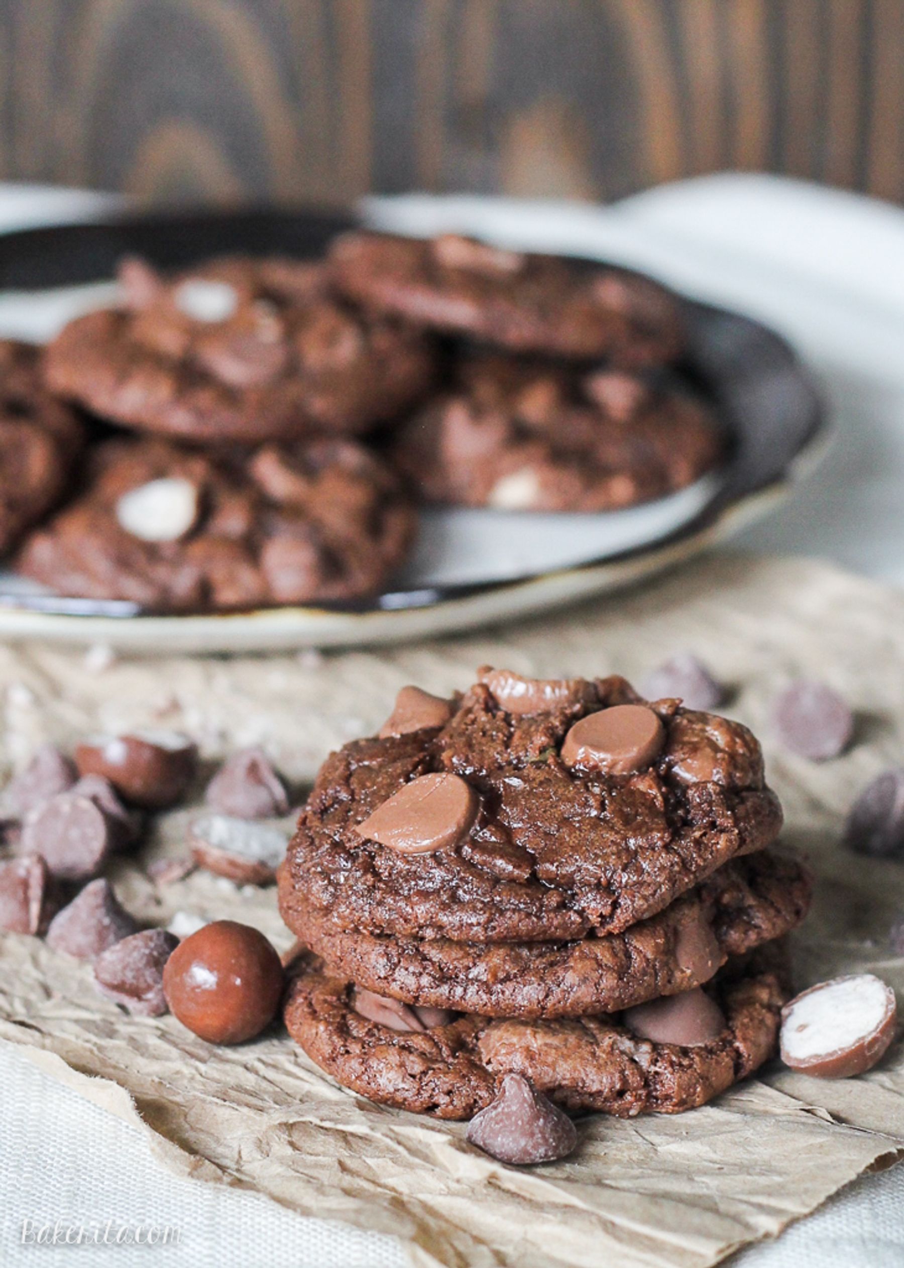 These Chocolate Malt Ball Cookies are rich chocolate fudge cookies packed with malted milk powder, chocolate chips, and malt balls.