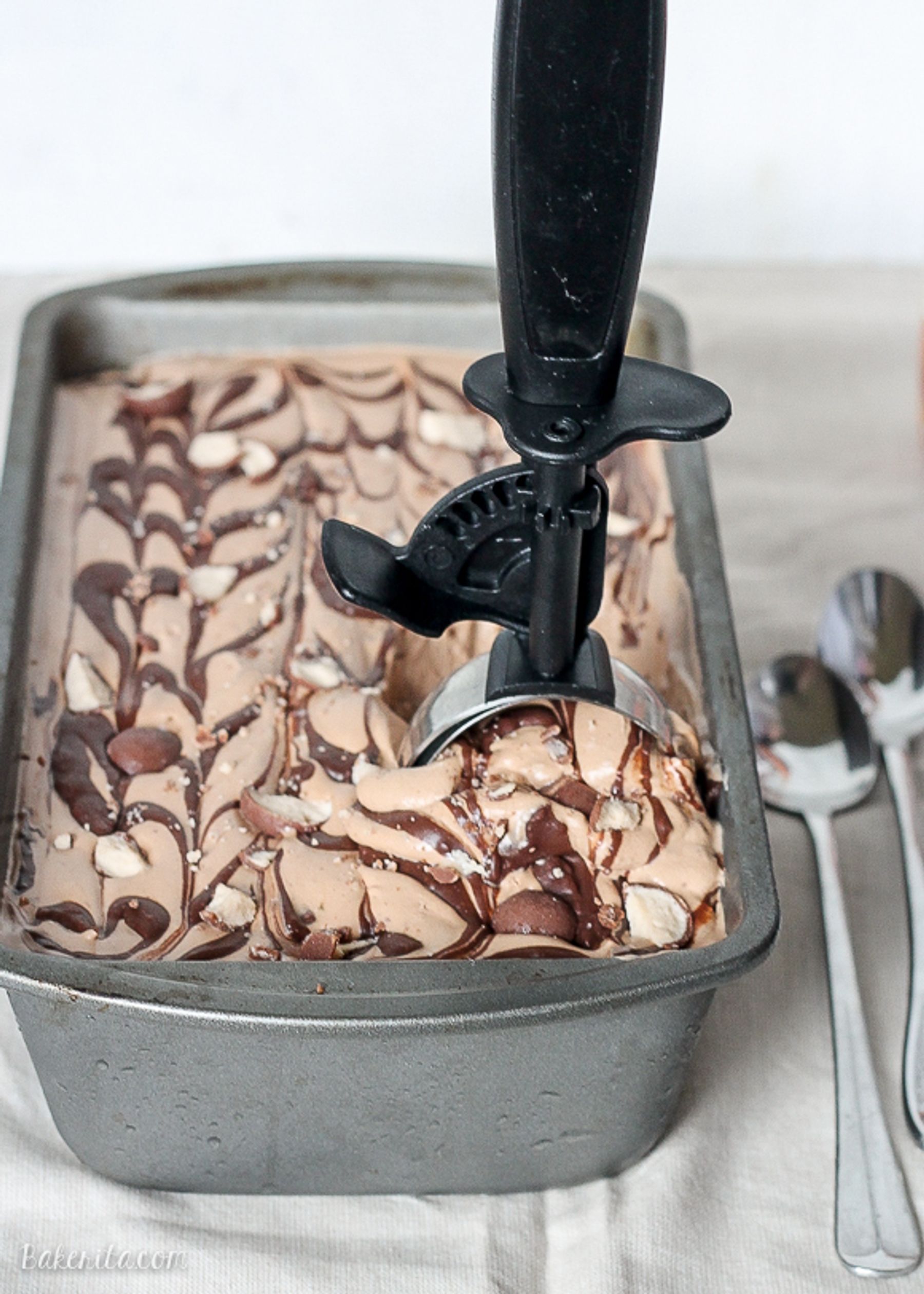 This Chocolate Malt Mocha Crunch Ice Cream is a luscious chocolate ice cream flavored with chocolate malt and coffee, with crunchy malt balls and a chocolate ganache swirl! No ice cream machine required.