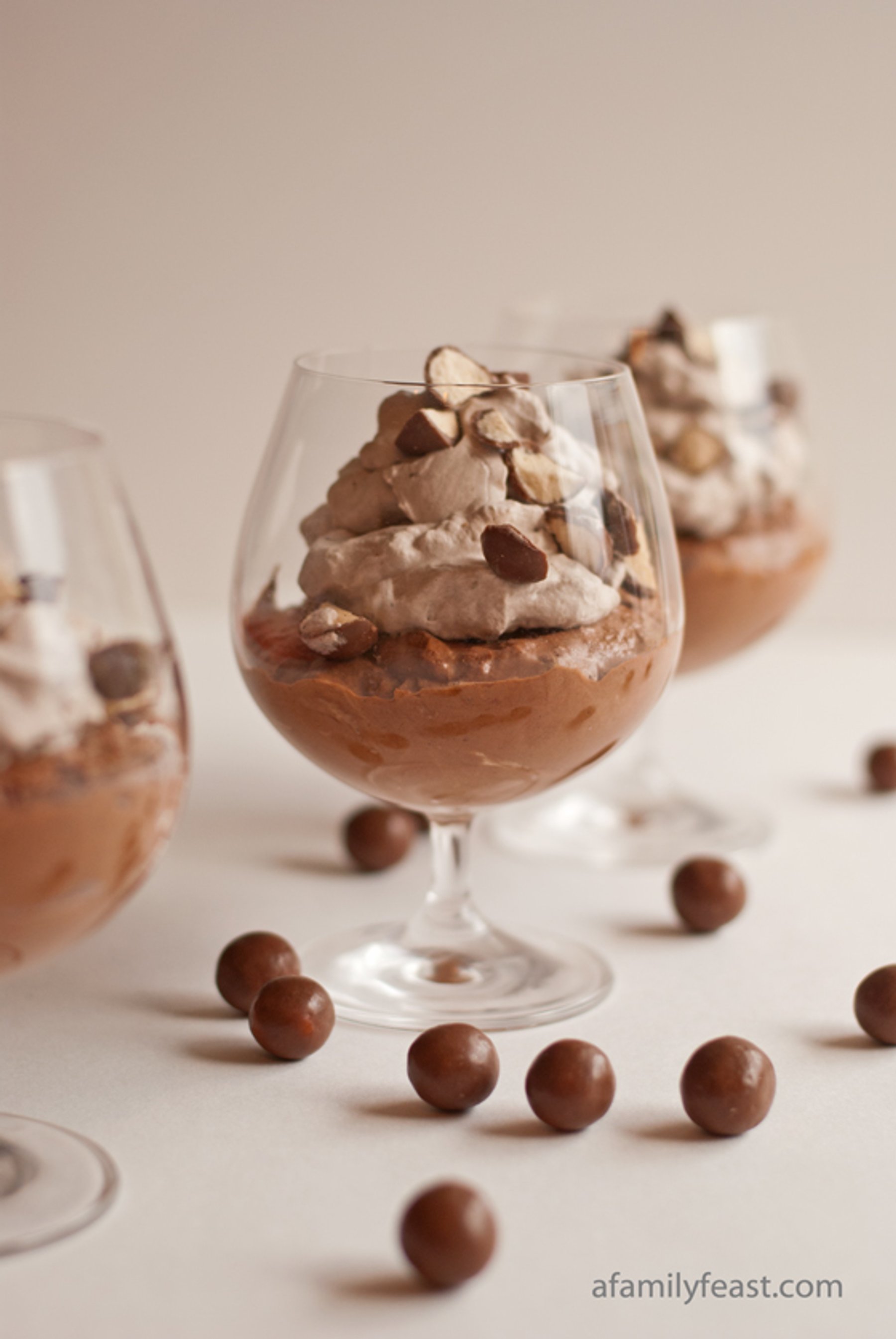 I love dessert mousses. There’s just something about a light and creamy dessert that appeals to me more than anything (well – except for maybe ice cream!) and this recipe for Chocolate Malted Mousse is right up there with one of my all-time favorite mousse recipes. This recipe combines crushed malted milk balls, chocolate malted milk powder, two kinds of melted chocolate, whipped cream and chocolate liqueur (we used Kahlua since we had that on hand) to make a sweet, rich and creamy chocolate m