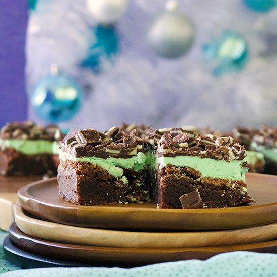 Rich chocolate brownies, topped with mint icing, bitter chocolate glaze, and chopped creme de menthe mints.