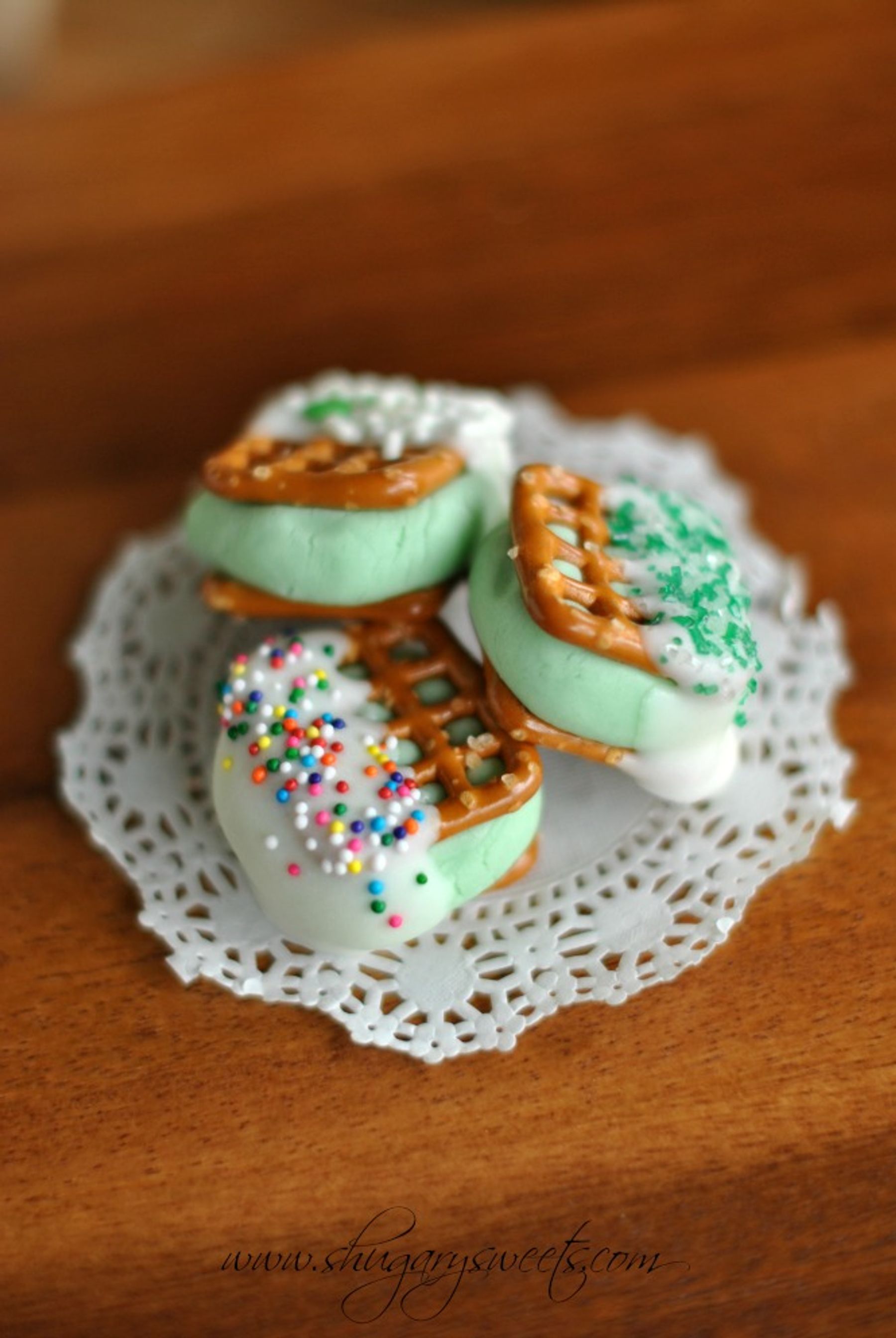 Homemade chocolate mint center between two pretzel snaps. Dipped in chocolate and sprinkles for a fun holiday treat!