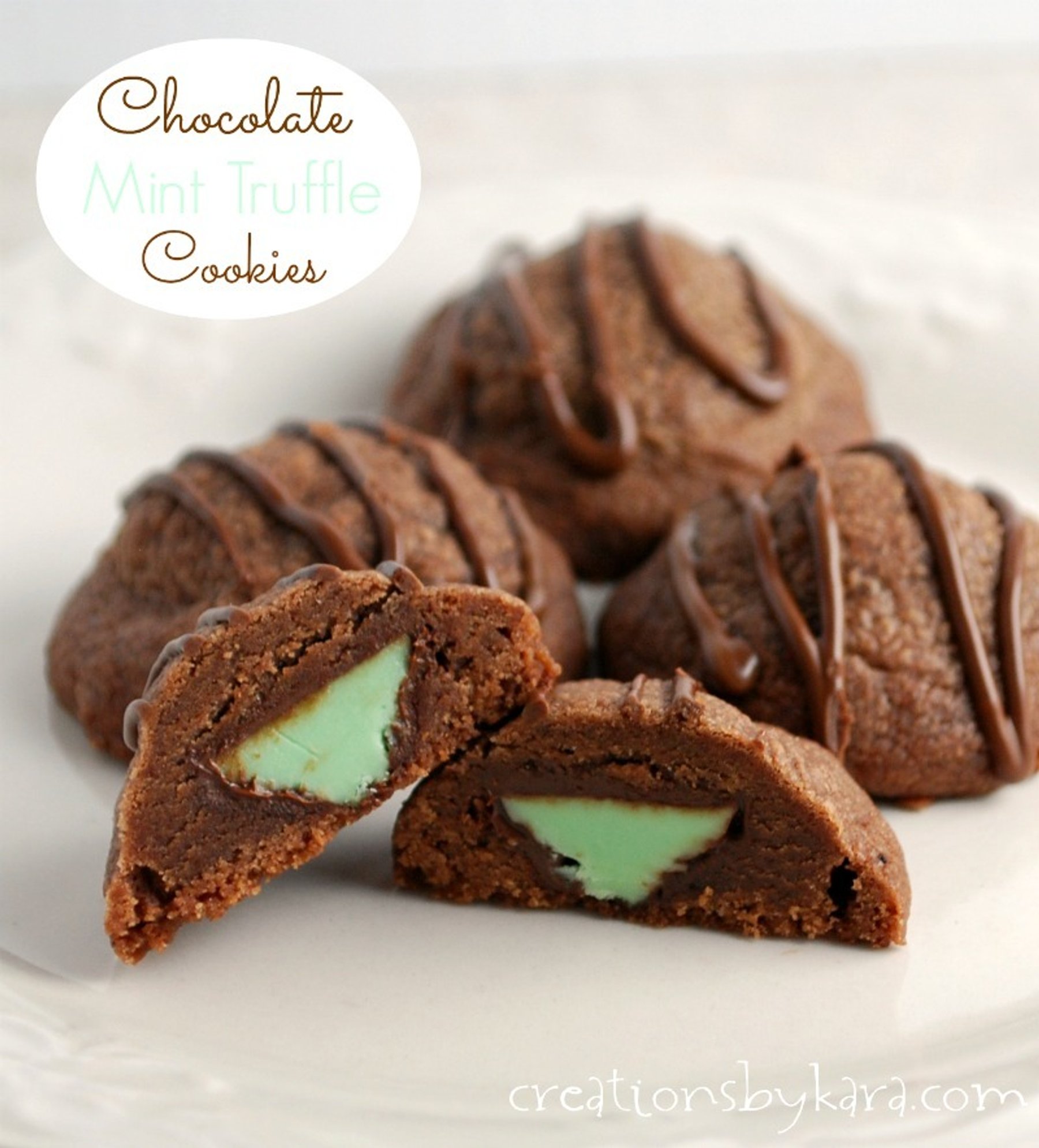 Fudgy cookies with a mint truffle Hershey kiss in the middle. A perfect Christmas cookie!