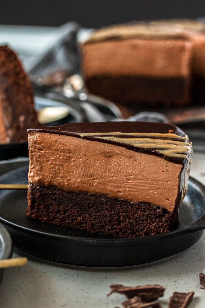 A gorgeous, dense mud cake base topped with smooth, creamy, easy chocolate mousse. This showstopping chocolate mud cake is covered with a chocolate mirror glaze and is decadence at it's best.