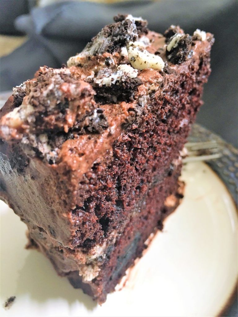 A chocolate cake with chopped Oreo pieces baked into the batter and sandwiched between a layer of cookies n'cream frosting. Topped with chocolate frosting and more Oreos!