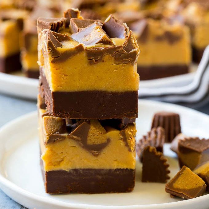 This recipe for chocolate peanut butter fudge is a layered treat made with two types of fudge and topped with peanut butter cups. It's an easy treat that's perfect for parties and gift giving!