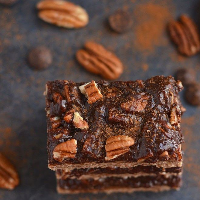 Chocolate Pecan Pie Bars! A healthy spin on pecan pie made free of gluten & refined sugar. EASY to bake & perfectly portioned for those watching their weight! Vegan + Gluten Free + Low Calorie