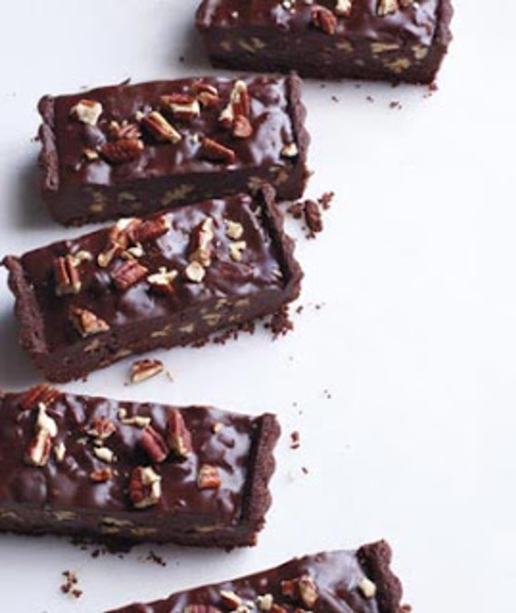 Heat oven to 350° F. Spread the pecans on a rimmed baking sheet and toast, tossing once, until fragrant, 6 to 8 minutes. Let cool, then roughly chop. In a medium bowl, whisk together the flour, cocoa...
