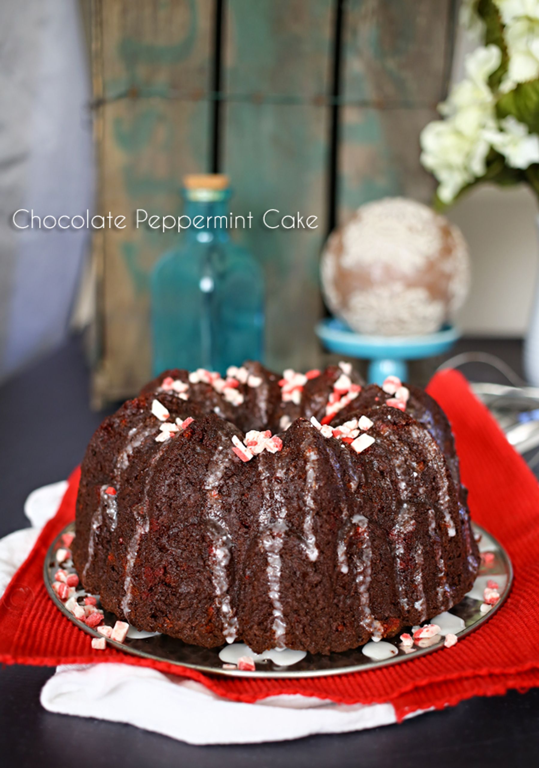Rich & moist chocolate bundt cake with bits of peppermint & peppermint glaze.