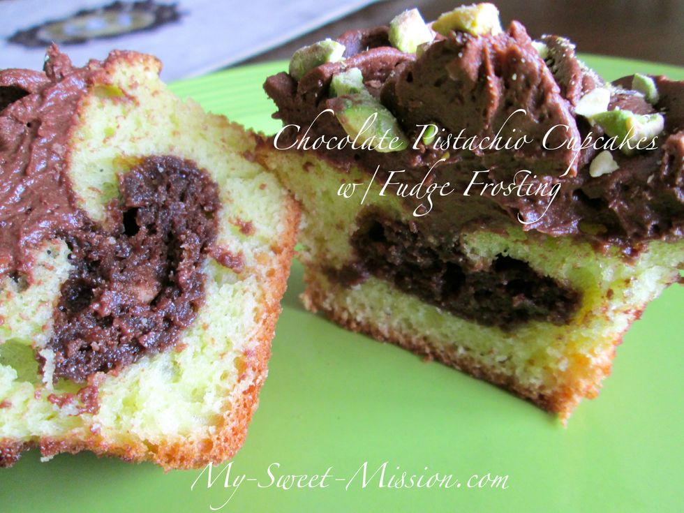 Moist pistachio cupcakes with chocolate inside then topped with a fudgey frosting and bits of pistachio nuts! I delicious combination you're sure to love!