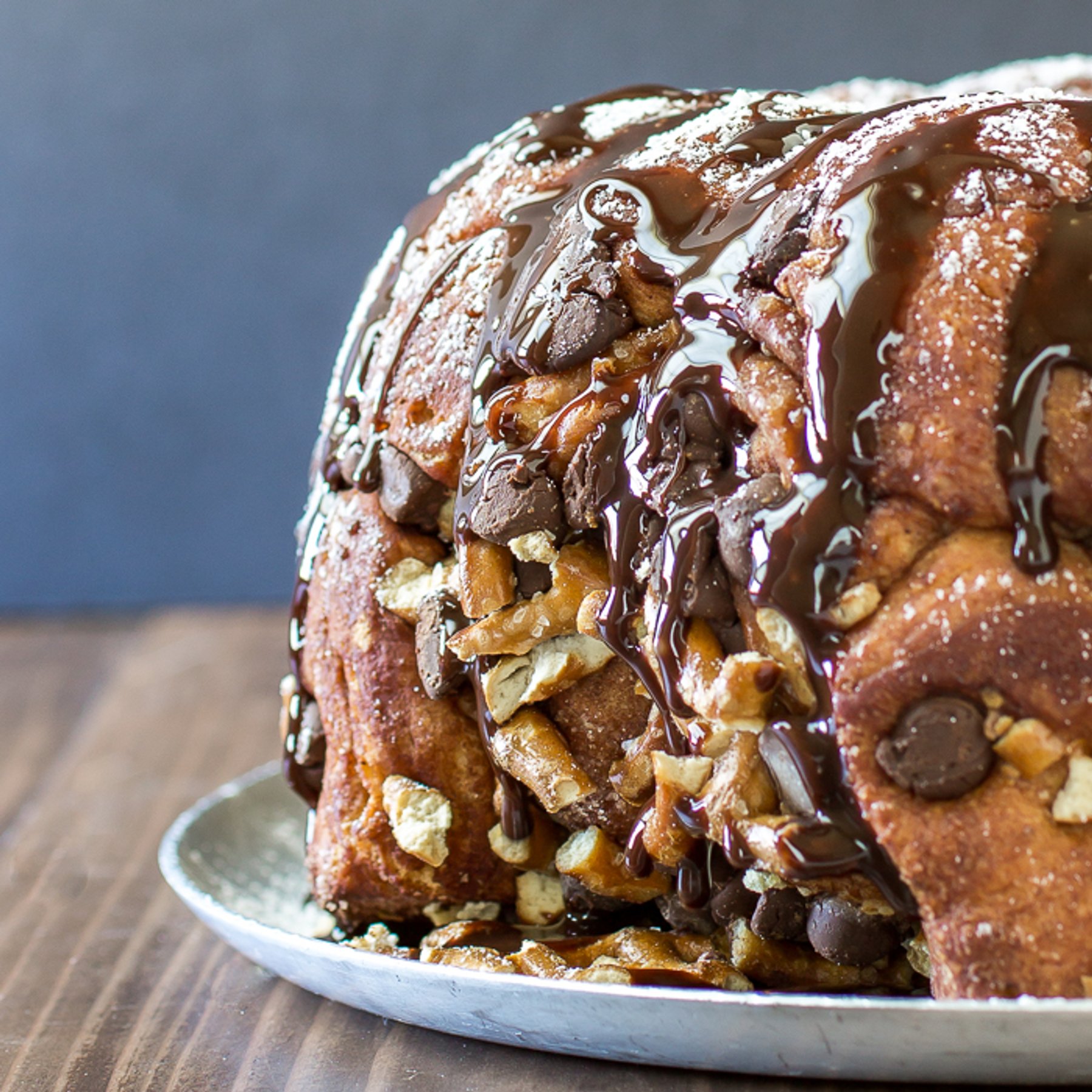 Chocolatey and crunchy, sweet and salty, Chocolate Pretzel Monkey Bread is fun to eat and a delicious dessert. Sprinkle with confectioner’s sugar and drizzle with chocolate sauce for a delectably sweet treat!