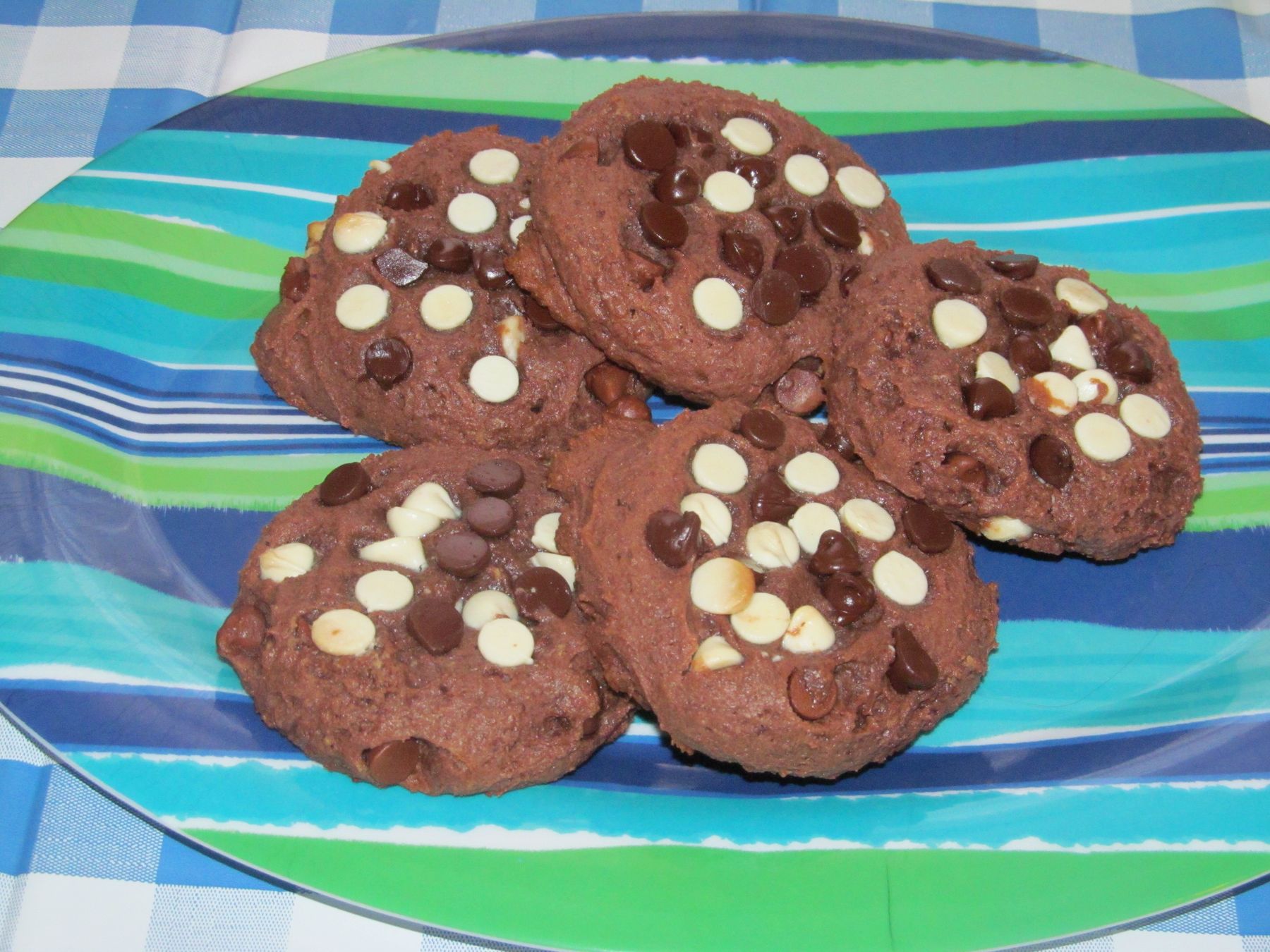 preheat oven 350, mix all dry ingredients in one bowl including 2 cups milk chocolate chips; mix wet ingredients in another bowl and incorporate dry ingredients. using a icecream scoop, scoop out dough onto wax paper and press semi sweet chocolate chips into top and bake for 18 min.