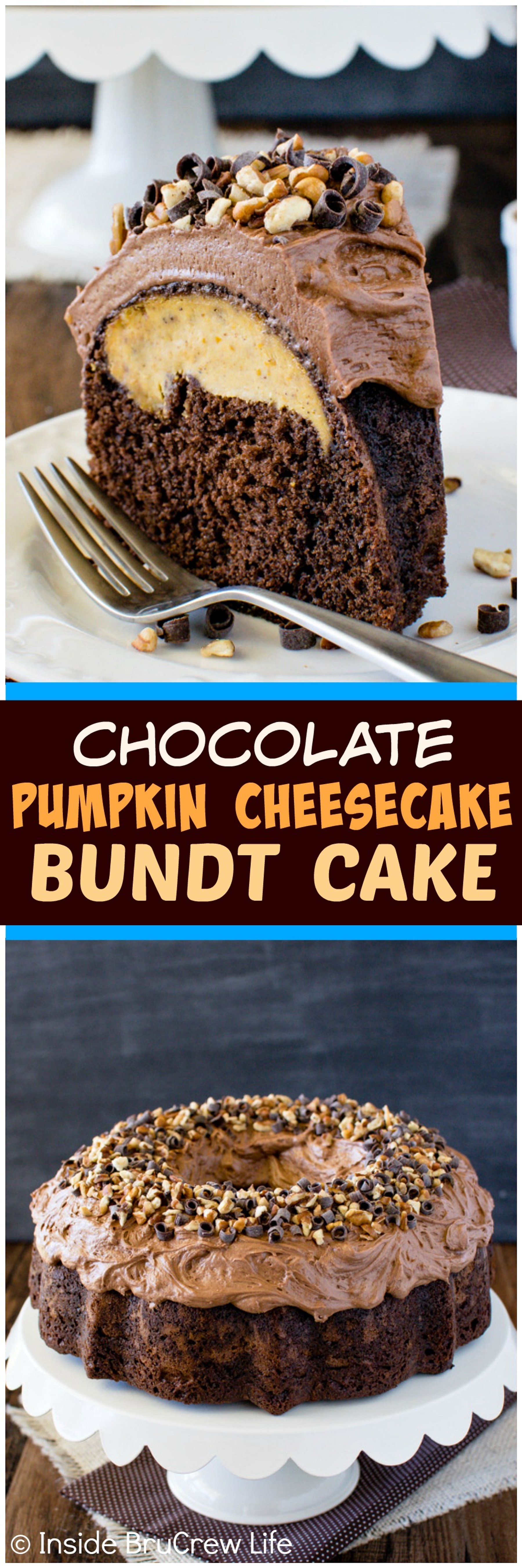 A creamy pumpkin center and chocolate frosting adds a fun fall flair to this Chocolate Pumpkin Cheesecake Bundt Cake.