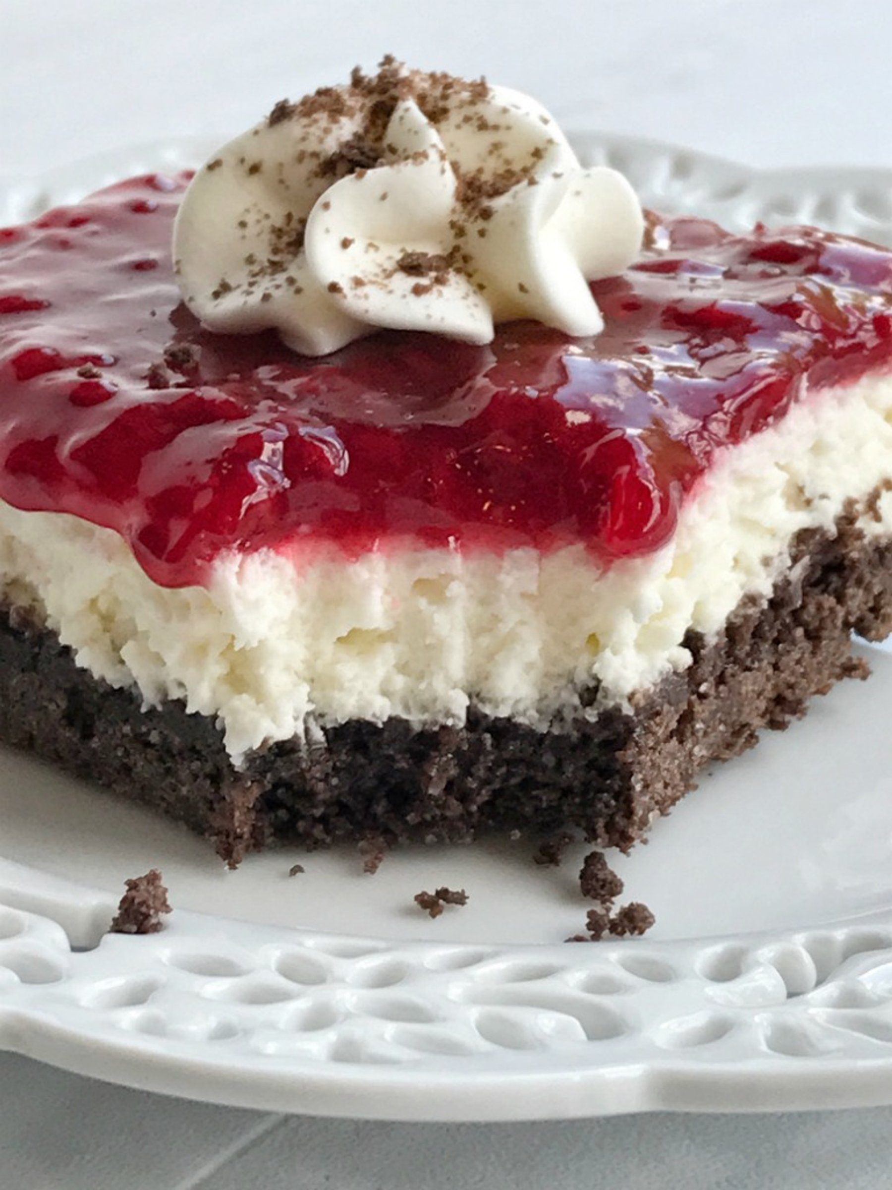 Chocolate raspberry cheesecake delight is an almost no-bake dessert with three delicious layers! A chocolate graham cracker crust, creamy sweet cheesecake middle, and topped with raspberry pie filling.