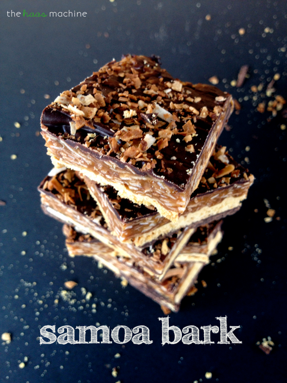 Last year, I attempted this Samoa Bark & nearly tore out several fillings. I did everything wrong when it comes to caramel– letting it sit on the heat for too long, piling it too high, & eating it straight from the freezer. I’m lucky that I didn’t have any serious bodily injuries because rock-hard caramel can be quite dangerous, as can scalding caramel, & a heaping bowl of innocent-looking unwrapped caramels. No wait, that’s just torture, nevermind. I’m going to the dentist tomorrow