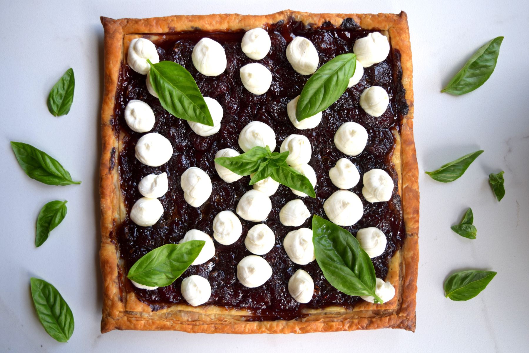 Desserts Chocolate Stout Cherry Tart with Honey and Vanilla Whipped Goat Cheese Rachelle Webber July 06, 2015 25 Cherries cooked in chocolate stout and baked on a puff pastry topped with honey and vanilla whipped goat cheese.