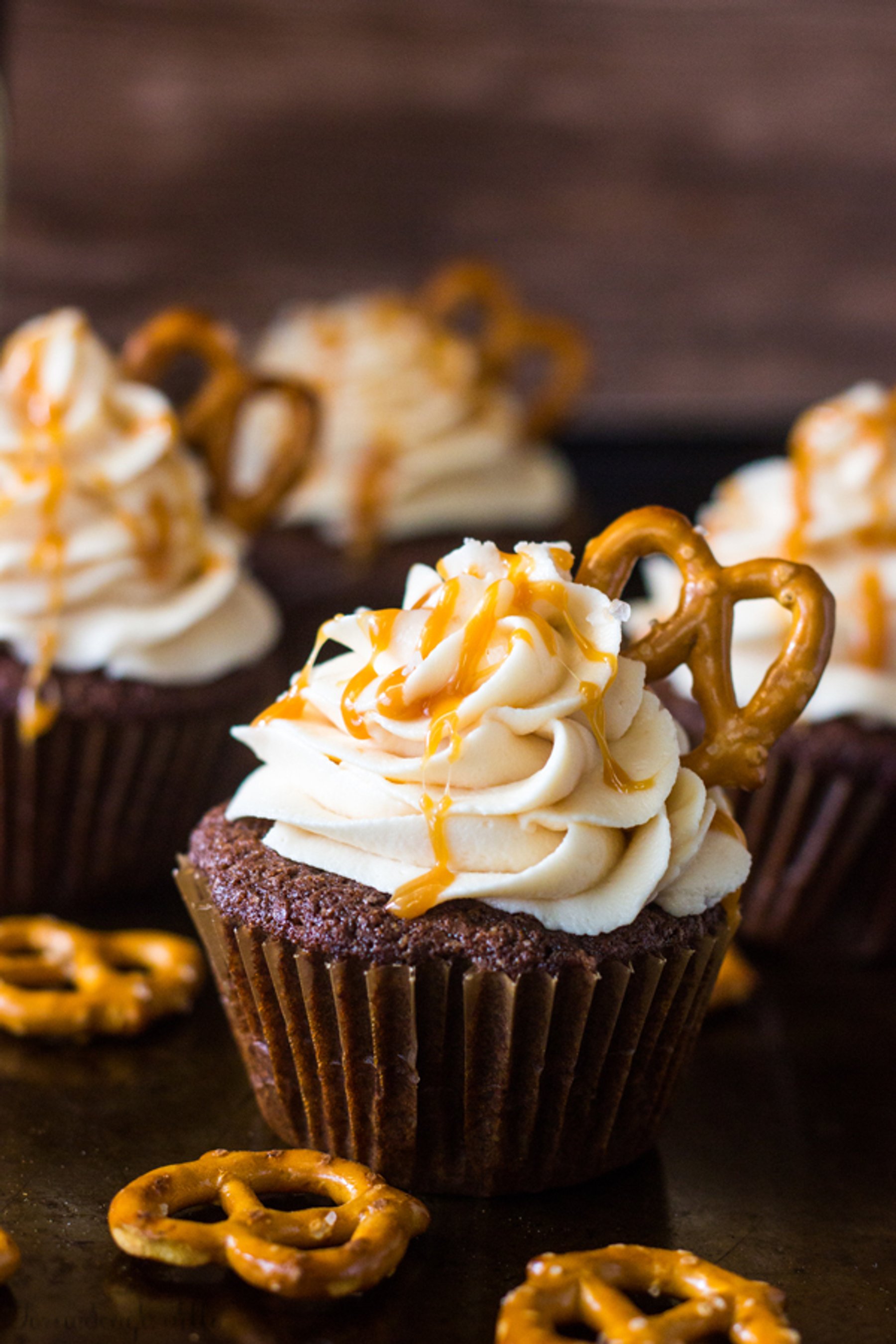 A chocolate stout cupcake is frosted with a salted caramel buttercream, sprinkled with sea salt and drizzled with caramel.