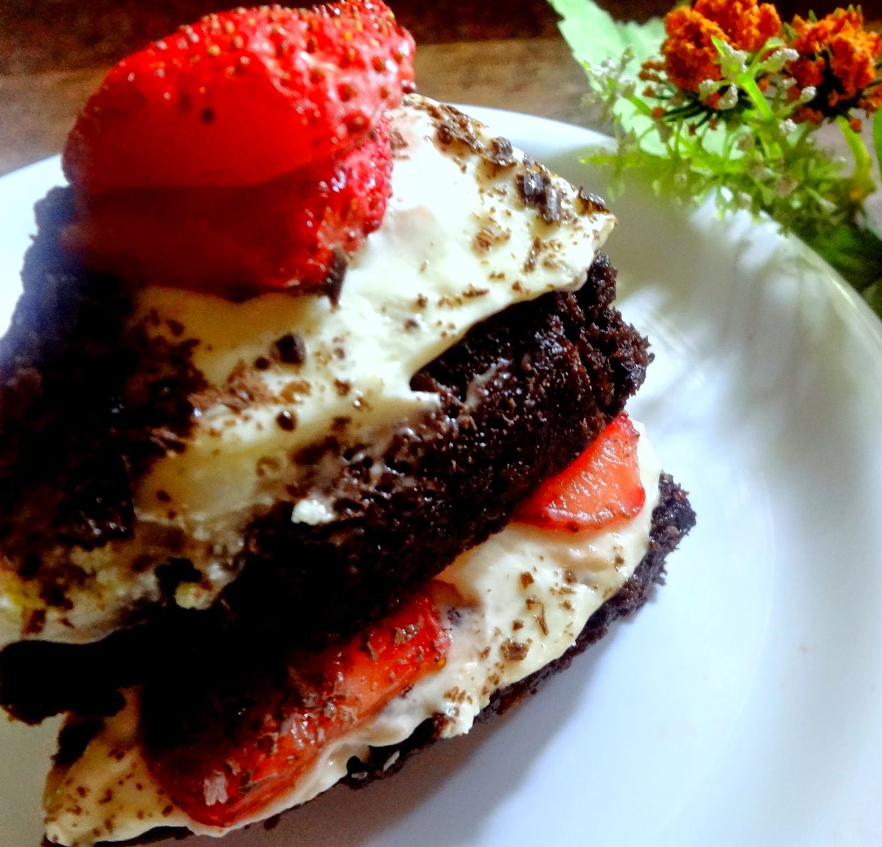 This is a delicious eggless no butter chocolate strawberry cake sandwiched with some light whipping cream , layered with luscious strawberries and topped with more frosting.A perfect anytime cake that is not too decadent yet looks sinfully scrumptious.As this cake is eggless and no butter , It makes it light in calories so you can guilt free pleasures .