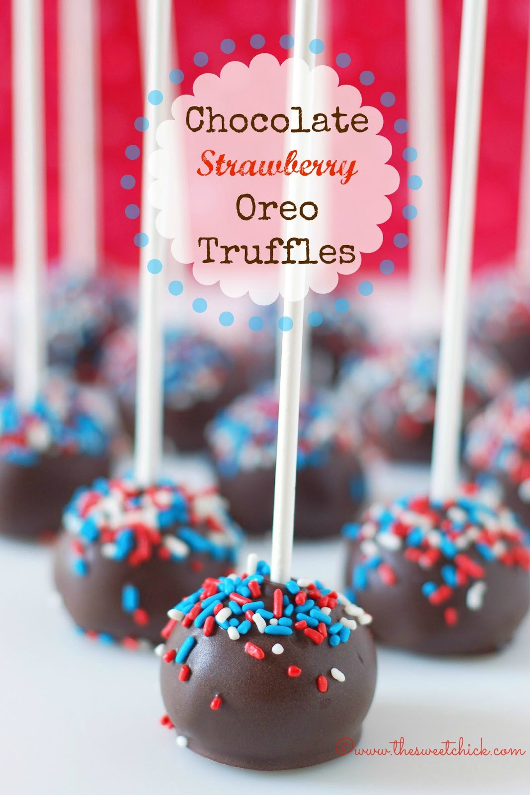 For the truffles Crush Oreo cookies in a food processor until they are a dirt like consistency. In a stand mixer or with a hand mixer, mix the cream cheese until softened. Then add the crushed Oreos a little at a time until well incorporated and the mixture becomes a dough like consistency. Roll Oreo mixture into 1 inch balls and place in airtight container lined with wax paper. Place the container in the freezer for at least 1 hour to set. For the topping and decorations After the balls are set, place candy melt in a glass container and melt in the microwave as per directions on package (30 second intervals , stirring in between). Remove Oreo balls from the freezer. Dip the tip of each lollipop stick in the candy melt and insert sticks into each ball. When the candy melt has hardened, pick up by the stick and dip the Oreo balls into candy coating until all covered. Once covered, remove and softly tap and rotate until excess candy melt falls off. Don't tap too hard or the Oreo ball will fall off, too. Then place pops on wax paper, stick facing upwards. Add sprinkles before the candy melt hardens. Once the candy melt has hardened you are free to eat one! Do try to place the rest in an airtight container and store in the fridge for your party. These truffles can be made ahead of time and refrigerated for 3-4 days.