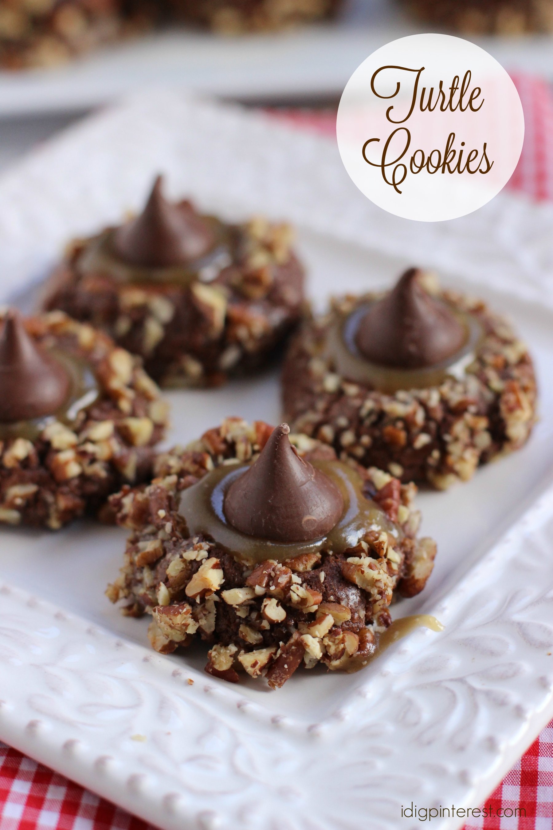 If you\\\'re a Turtles candy fan, you\\\'ll love these decadent chocolate cookies, pressed with chopped pecans and topped with a soft homemade caramel filling and chocolate kiss!