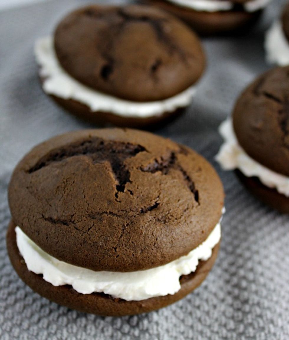 These chocolate whoopie pies have the lightest icing you will ever eat. Seriously the icing is like eating clouds. It is glorious! The chocolate cake is a perfect cakey texture that will have you craving a glass of milk!