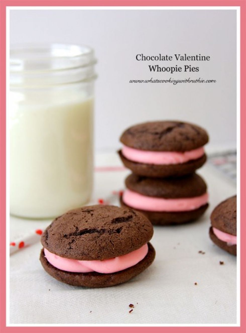Chocolate Valentine Whoopie Pies are moist and chocolatey with a pink cream cheese filing which makes the whole cookie divine
