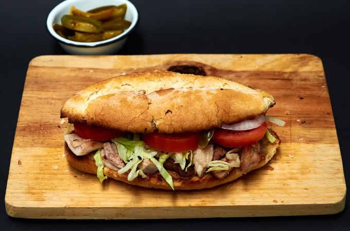 A great torta (a type of Mexican sandwich) prepared with chopped pork leg, refried beans, shredded lettuce, tomato, onion, jalapeños, and avocado served on a toasted roll.
