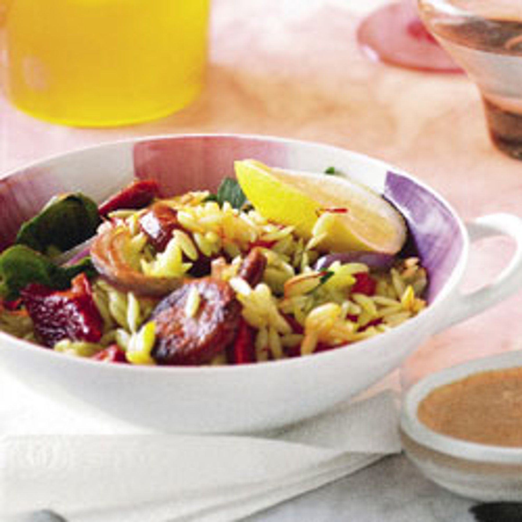 fry the chorizo for 4 minutes each side or until golden then add to the orzo, along with the spinach or rocket. toss to combine.