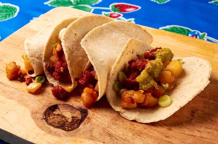 Easy chorizo and potato tacos topped with salsa verde just like at the taco stand.