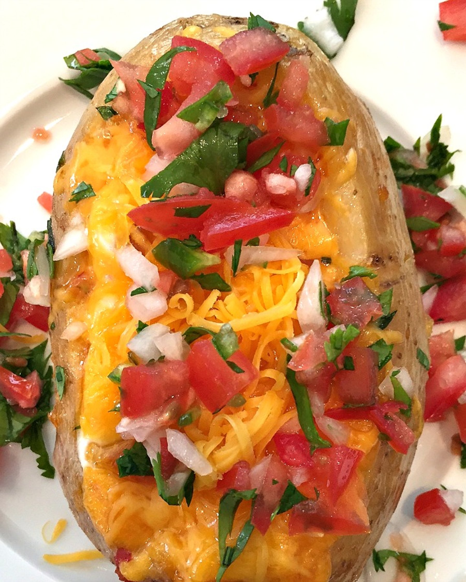 Chorizo Sausage, Cheese and Egg Stuffed Potato topped with Pico de Gallo.