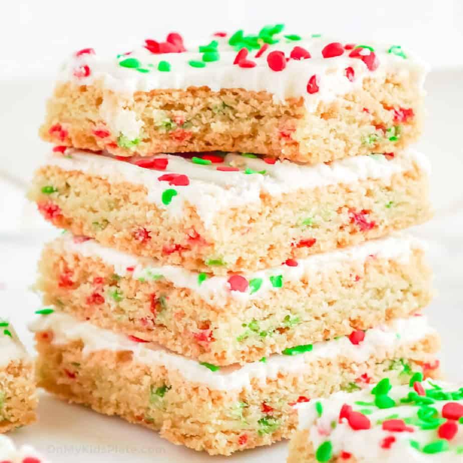 These ooey-gooey sugar cookie bars are buttery, sweet, and perfect for saving a little time this holiday season. Soft and chewy with the perfect amount of sweet frosting on top, these bars always please a crowd with no rolling required. Slice these bars for a cookie platter or to share with Santa, and you can of course swap out the sprinkles for any color all year long.