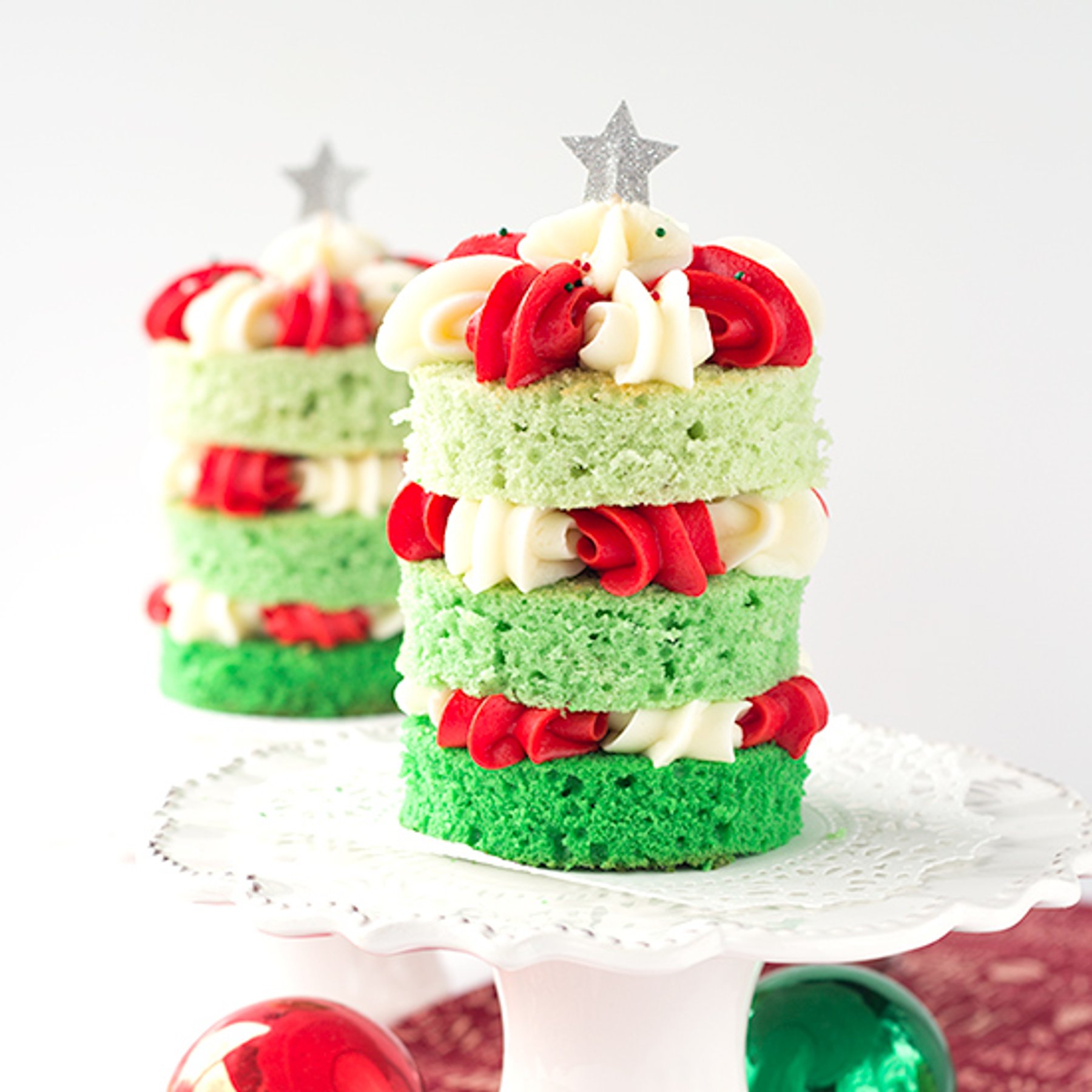 Christmas Tree Cake - Fun and festive green ombre cakes with red and white frosting piped in pretty shells.