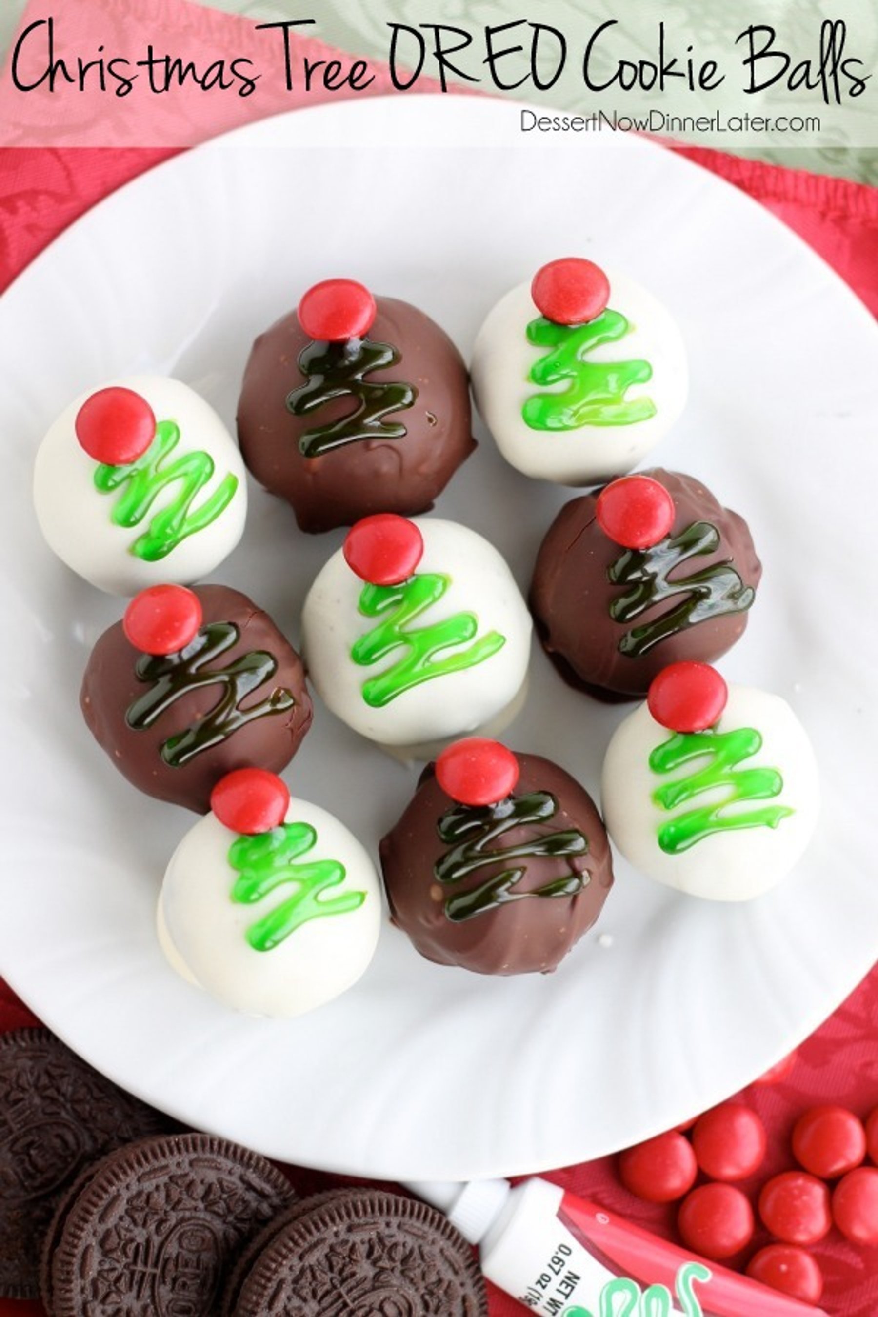 These traditionally made OREO Cookie Balls are decorated with green gel and a red M&M for a festive Christmas Tree treat!