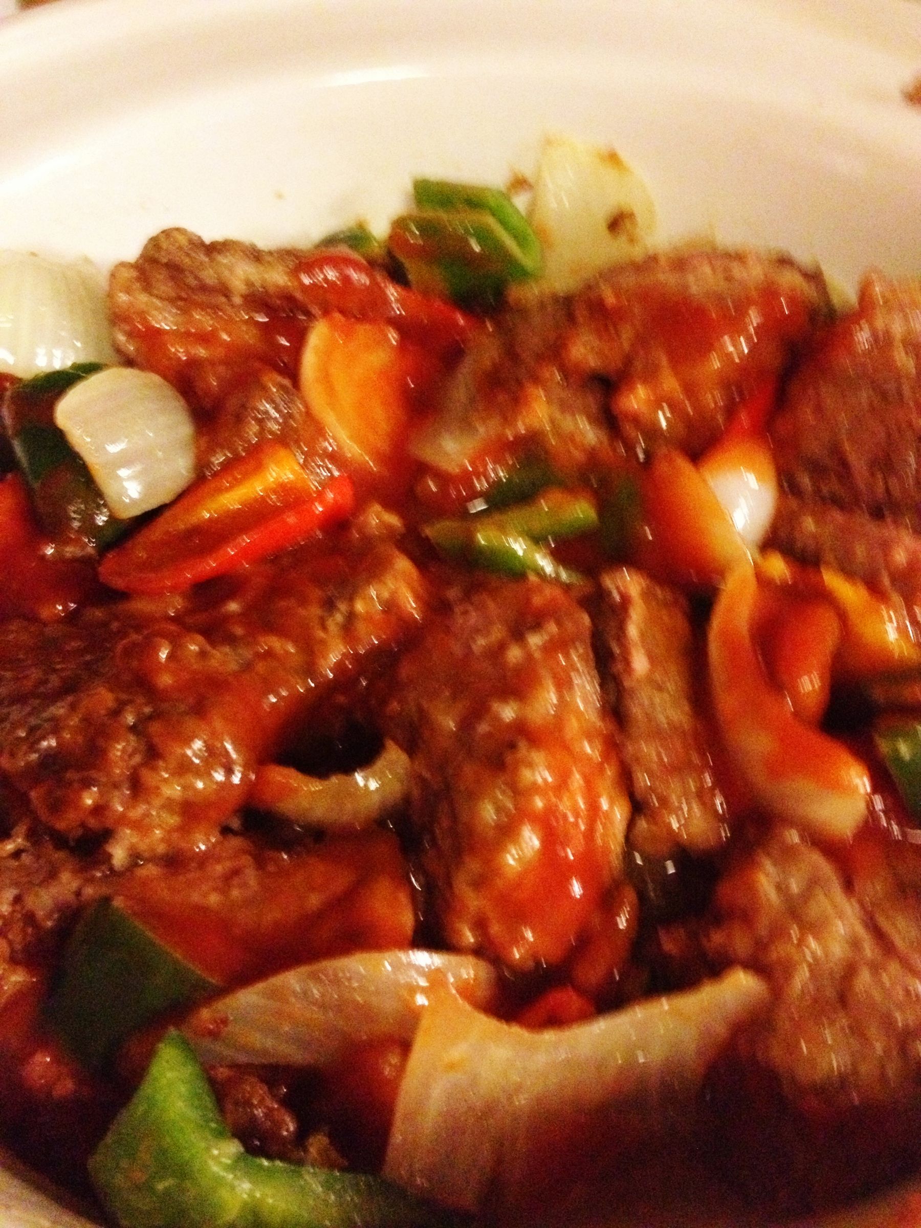 Heat oil until hot but not smoking in skillet. Dredge the roast chunks in flour mixture (salt, pepper and cumin) and brown on all sides in oil. Remove to crock pot and add onions and peppers to skillet....