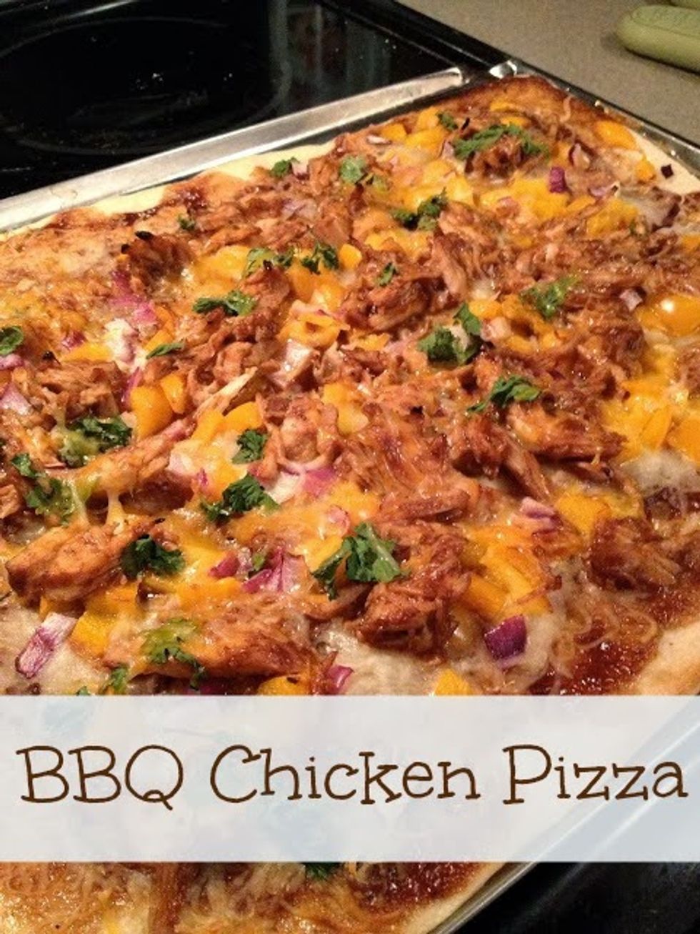Cook chicken fully and shred. Pour BBQ sauce onto shredded chicken and mix together. Roll out your dough. Place a small about of BBQ sauce on your dough and spread around. Top your pizza dough with chicken,...