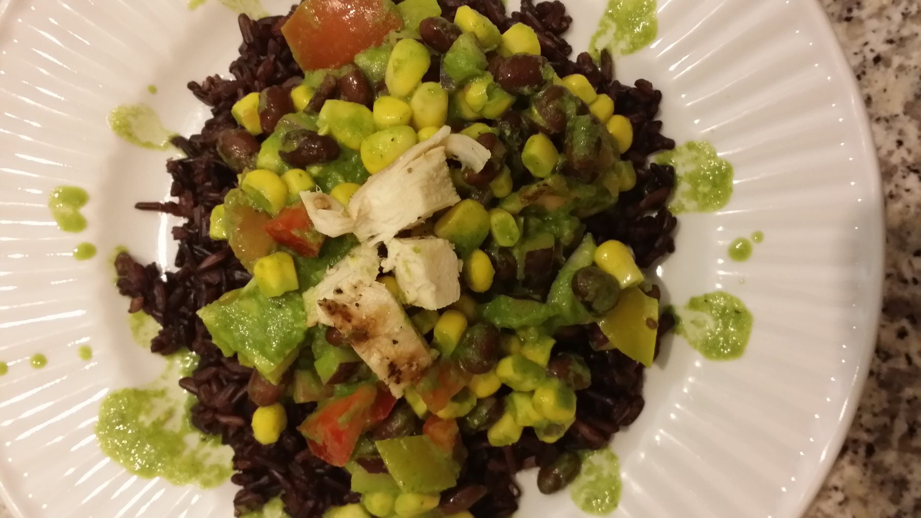 bell peppers, onions, black beans, avocados, (corn and tomatoes-optional), and grilled chicken.