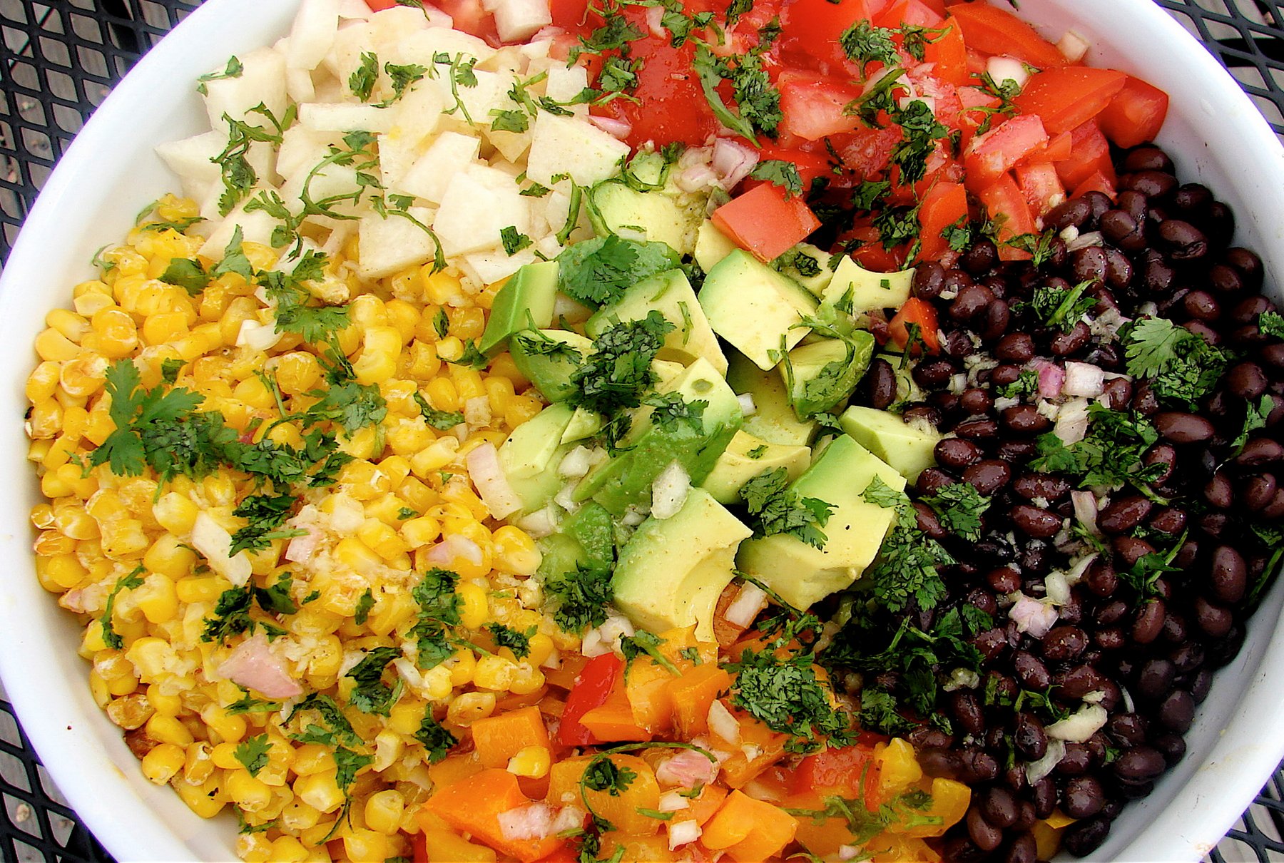 Hands down one of my FAVORITE salads I have ever tasted! The roasted peppers, crunchy jicama and cilantro lime dressing all add to the unique flavors and textures. I like to display in a large bowl or on a white platter in rows. This is good enough to serve at a luncheon with your girlfriends! Enjoy.