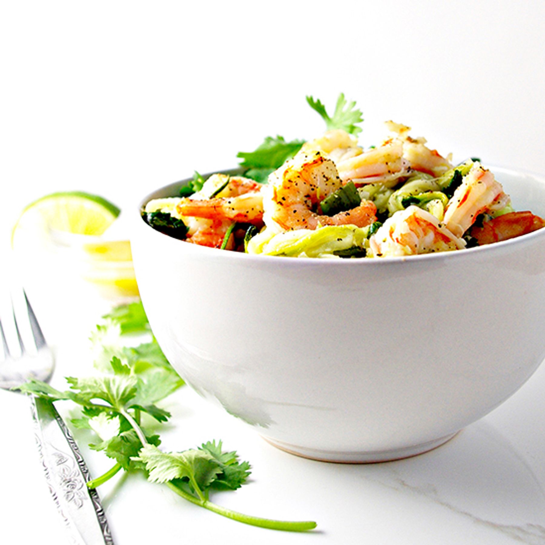 Zoodles + shrimp + lime + cilantro, all in a cozy bowl of goodness???? Get out! Nope. It\\\'s true. And it gets even better because this bowl of shrimp and Zoodles also includes cilantro, green onion, garlic, and LIME!!!!! Whaaaat? Yes. All of this amazingness in just one tiny bowl.