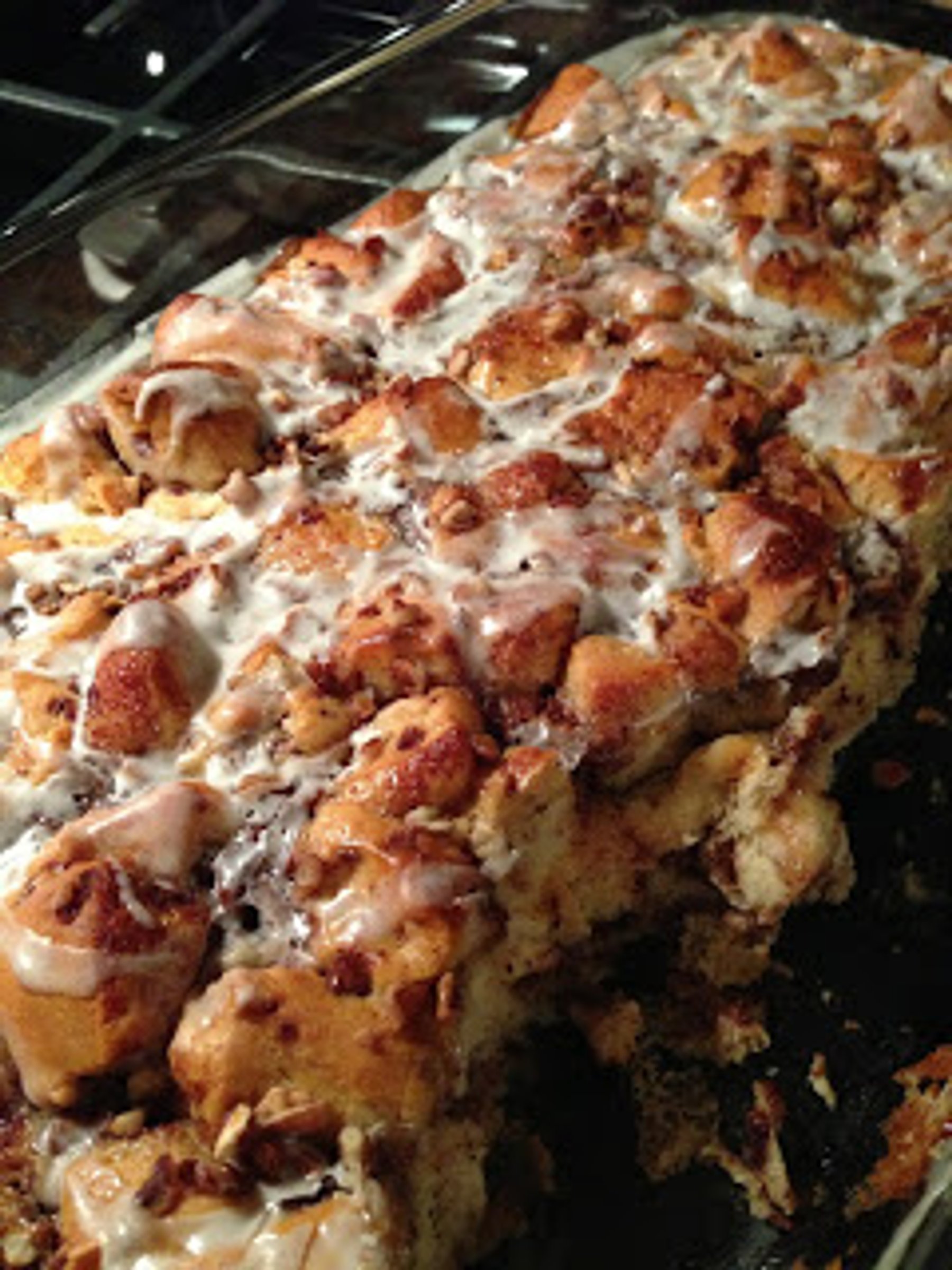 Melt butter and pour on an ungreased 9x13 baking pan. Separate cans of dough into 16 rolls and set icing aside for later. Cut each roll into 8 pieces and add to buttered baking pan. Beat eggs in medium...