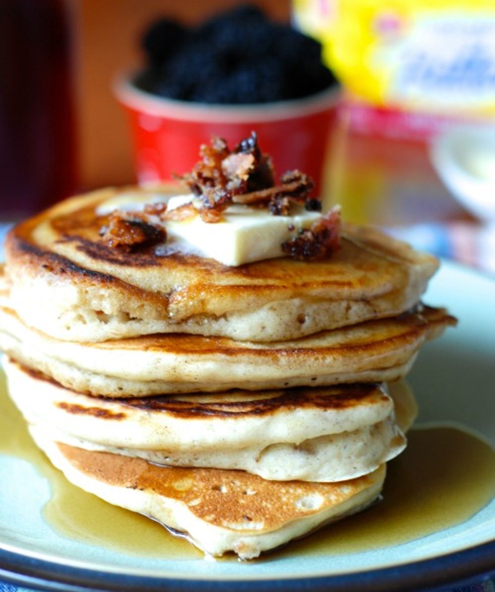 Fluffy cinnamon flavored pancakes loaded with candied bacon crumbles.